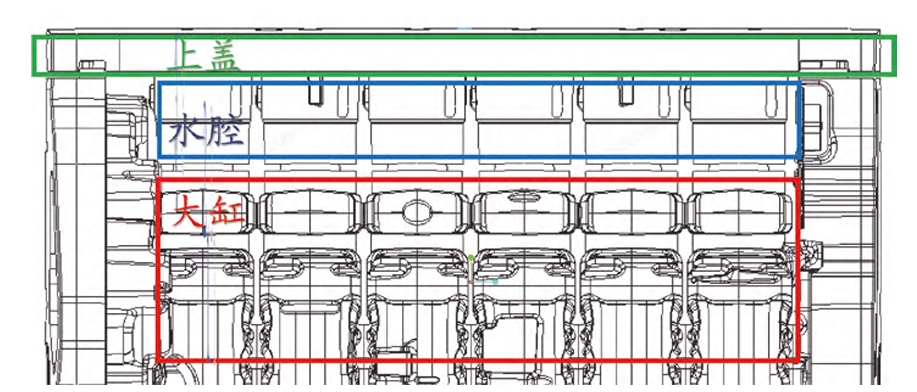 During the manufacturing of cylinder block castings, the large sand cores, including those for the large cylinder, water jacket, and upper cover, account for 95.6% of the total volume. To efficiently vent the gases generated during pouring, cylindrical exhaust channels can be set in the centers of these sand cores.